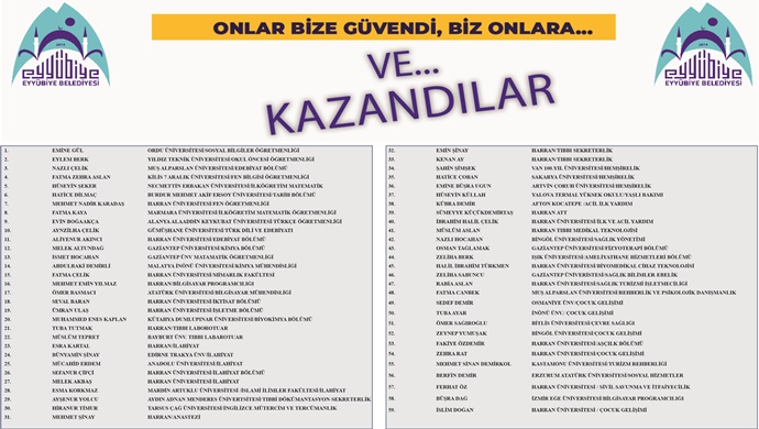 Gençlere, çocuklara, engellilere, kadınlara ve yaşlılara yönelik hizmetlerde pozitif ayrımcılık uygulayan Eyyübiye Belediyesi’nin destekleriyle üniversite hayallerine ulaşan öğrenciler ve kazandıkları bölümler şöyle: